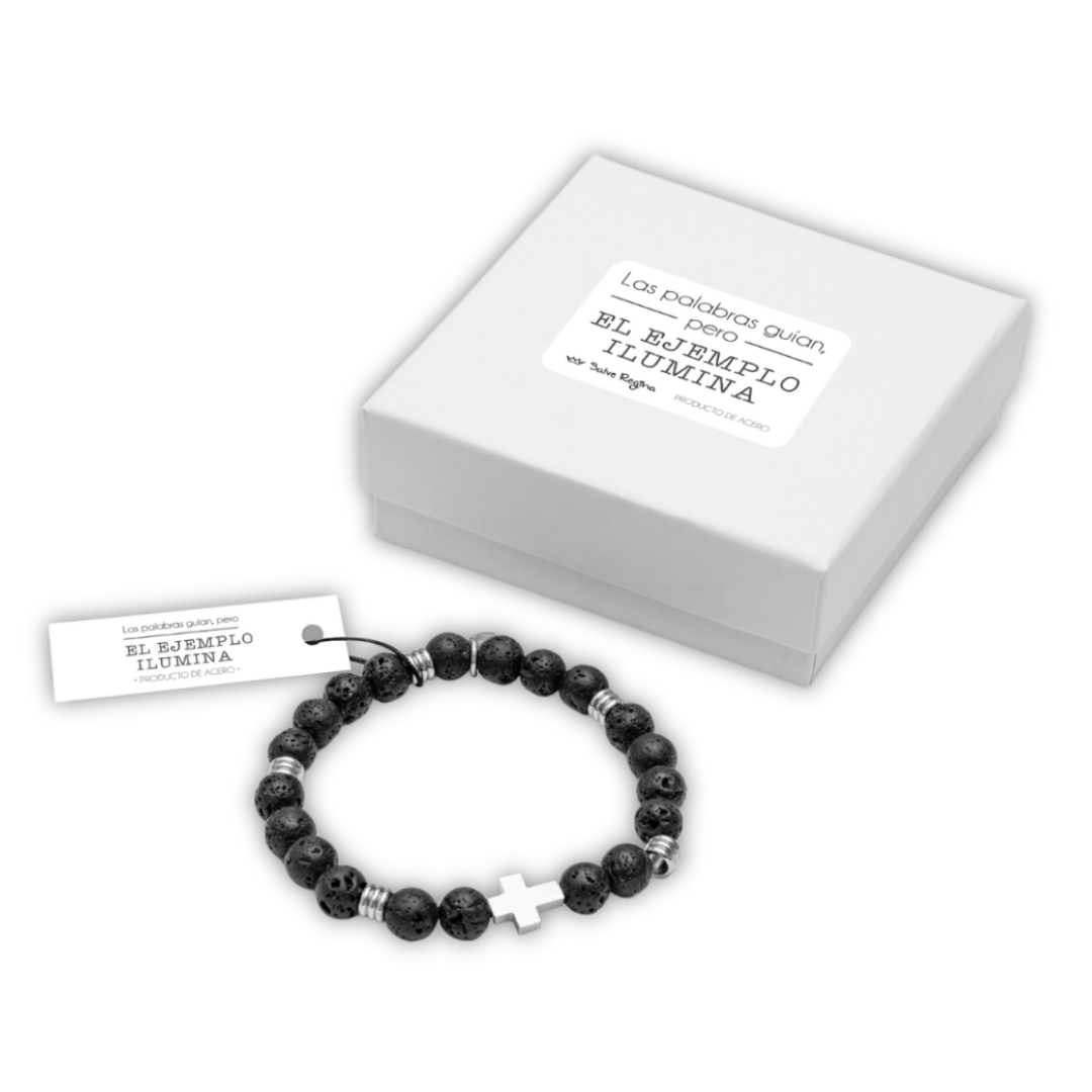 Pulsera elastizada con piedra volcánica y un dije de acero, pensada para quienes eligen marcar la diferencia desde el ejemplo. Su diseño la convierte en un accesorio ideal para sumar personalidad a cualquier look. Está hecha con materiales de alta calidad para que te acompañe en todas tus aventuras. Además, viene en una caja reutilizable con un diseño especial, lo que la transforma en el regalo perfecto para alguien que te inspira. La piedra volcánica se asocia con la fuerza, la estabilidad, el coraje y la conexión con la tierra.